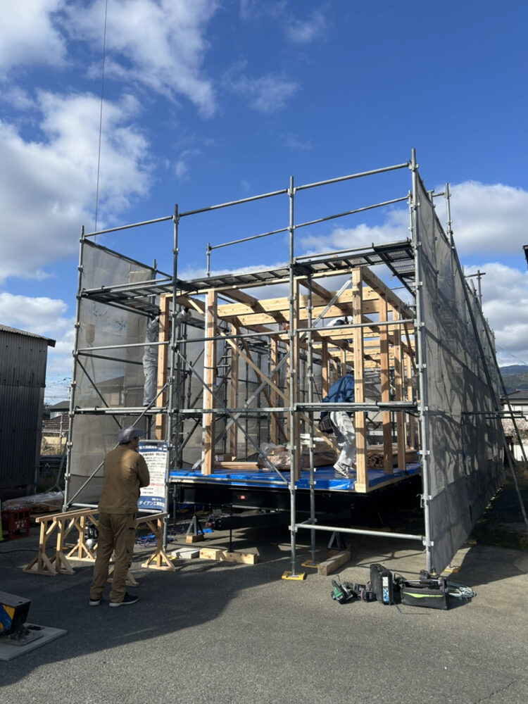 本日は青空の下、トレーラーハウスの骨組みが完成しました!!